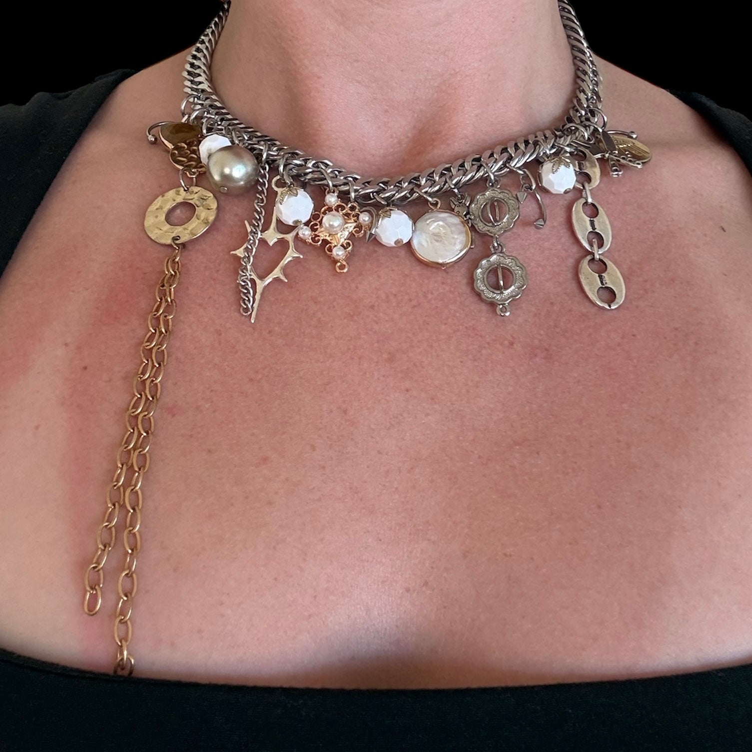 Silver and gold tone metal up-cycled necklace with repurposed items and charms