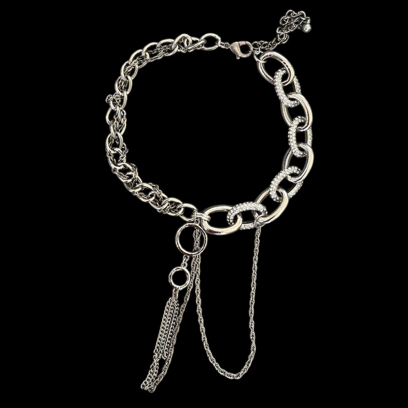 Features silver chains and links with rhinestone embellishments.